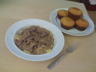 The muffins were a pleasant new flavor experience with a crumbly, cornbread texture. And the stroganoff was rich, creamy, and, most importantly, comforting.